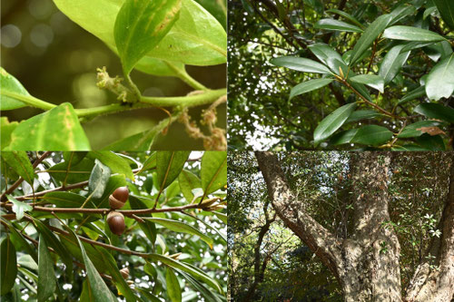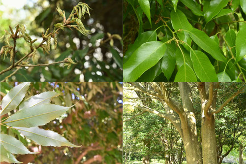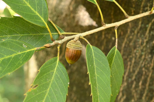 ドングリができで、なおかつ冬でも葉を落とさない木です。濃緑の大きな葉を持つ品種が多く、ドングリは葉の陰になって発見しにくいこともあります。