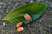 ・ドングリは長さ1.5~2センチほどの卵形あるいは楕円形で、殻斗と呼ばれる帽子部分には5~7層の横縞があり、細かな毛が密生する。葉がよく似たシラカシのドングリは開花した年に熟すが、ウラジロガシのドングリが熟すのは開花翌年の10~11月頃のこと。