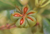 ・果実は黄褐色で長さ1~3センチほど。頂部には残存した萼があって壺型になる。果実が熟すのは冬で、自然に開裂する。食用になるが、学名にあるMelastomaは「黒い口」を意味し、果実を食べると口の中が黒紫色になる。果実や葉は染料に、根は薬用に使われる。